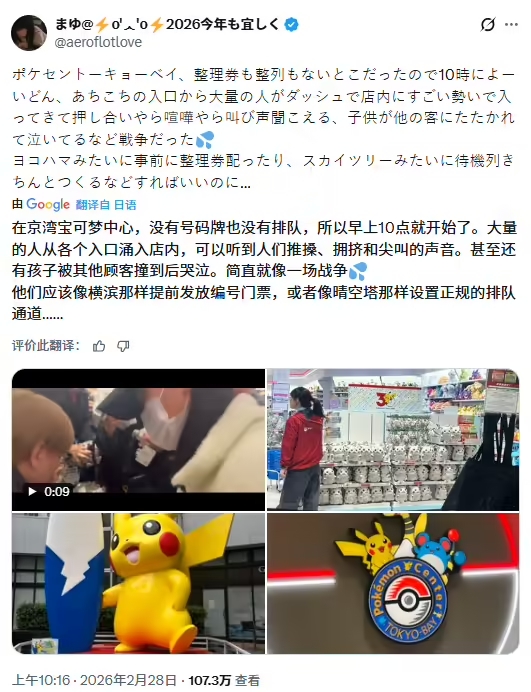 用户 aeroflotlove 在 X(原推特)上分享了东京湾宝可梦中心的混乱视频,并描述了大家恐慌抢购这款限量版皮卡丘玩偶的场面:
