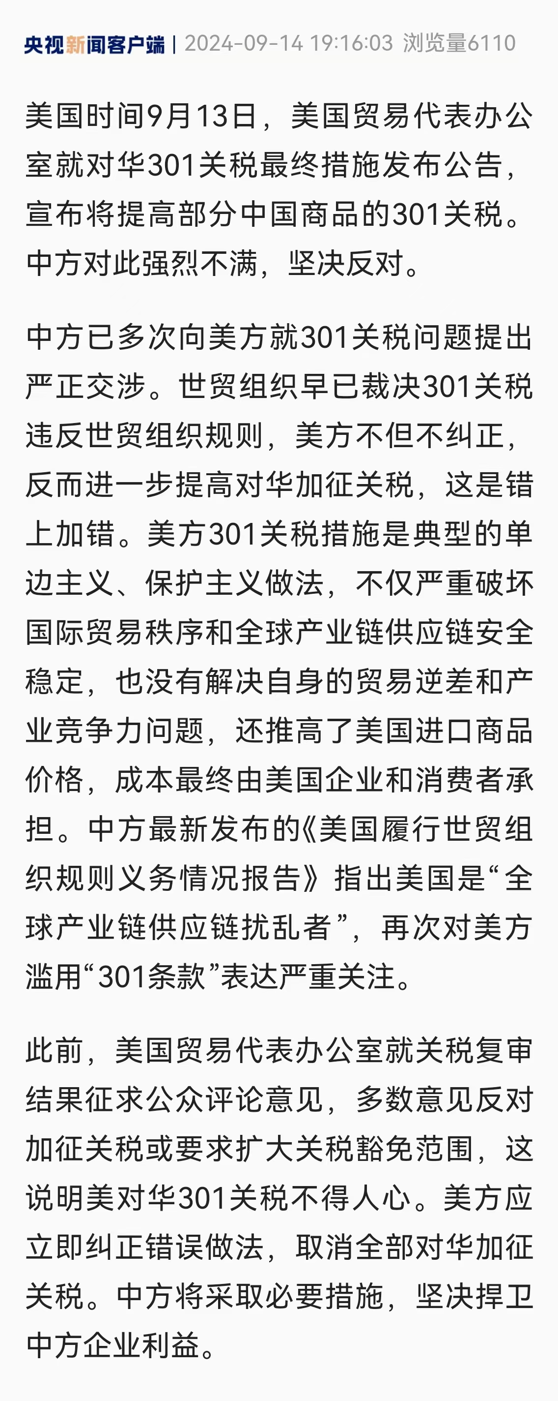 商务部新闻发言人就美发布提高部分对华301关税最终措施发表谈话 Posted on 2024年9月15日 By admin 商务部新闻发言人就美发布提高部分对华301关税最终措施发表谈话无评论 微信或QQ扫一扫 浏览量: 29 即时新闻
