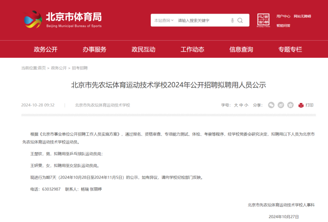 北京市体育局官网10月28日公开信息显示,根据《北京市事业单位公开招聘工作人员实施方案》,通过报名、资格审查、专项能力测试、体检、考察等程序,经学校党委会研究决定,拟聘用以下人员为北京市先农坛体育运动技术学校运动员。其中,奥运冠军王楚钦拟聘用至乒乓球队运动员岗。
