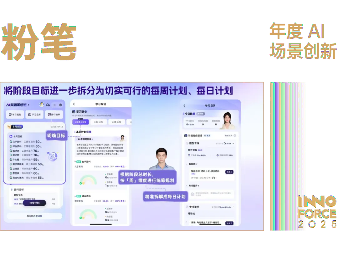 粉笔的突破不仅是单一的产品创新,更是对传统职业教育「千人一面」模式的深刻变革。它凭借在「垂域大模型」上的首创性探索,以及对「AI 产品矩阵」的快速布局,有力冲击了「名师资源稀缺、个性化辅导昂贵」的行业痛点,为数千万考生提供了更高效、更普惠的智能教育解决方案,很好地诠释了「AI 教育创新」的价值。