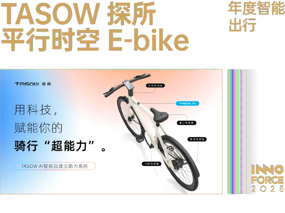 为了达到和自行车相近的骑行体验,探所「平行时空」将电池、电机等核心部件进行了一体化集成,同时使用了碳纤维材料,使得整车轻量化得到了有效控制,最长续航可达 100km。同时,TASOW AI 智能自适应助力系统,可以结合内置 4 大传感器,实时根据踏频、踩踏力度和坡度环境等,自动调整电机输出功率,实现「无感动力辅助」。