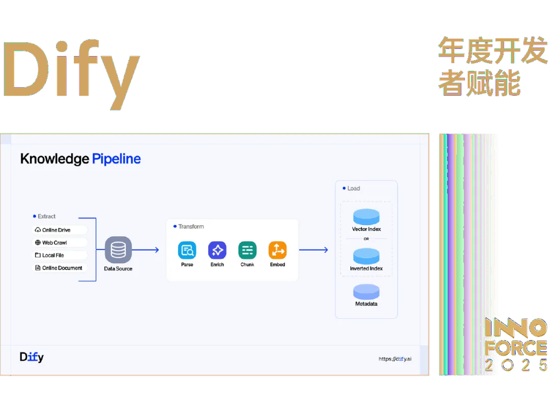 作为一款开源生成式 AI 应用开发平台,Dify 在 2025 年完成了两个关键升级:插件市场(Marketplace)的推出,让全球开发者能够像搭建积木一样自由组合与共享智能模块,推动了 AI 应用搭建的「组件化创新」;同时,全新的知识流水线(Knowledge Pipeline)重新定义了 RAG,让企业级知识管理进入可视化构建与高度自定义的新阶段。